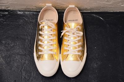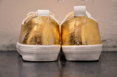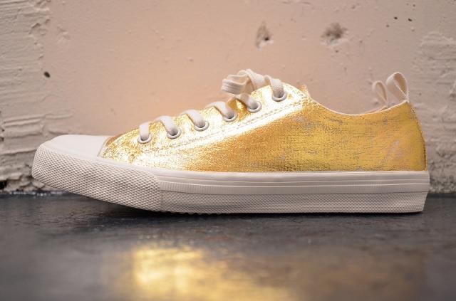 シンプルな白のキャンバスにあざやかなゴールドとシルバーの箔が重なり、プティローブノアーらしさが溢れるスニーカーに。シンプルな装いにも、ドレッシーなスタイルにも組み合わせたくなる存在感です。履くほどに独特な風合いに仕上がることも魅力です。煌びやかな見た目から少しくすんだ表情に変化し、使う人の個性が現れてきます。自分だけの特別な一足になりますように。