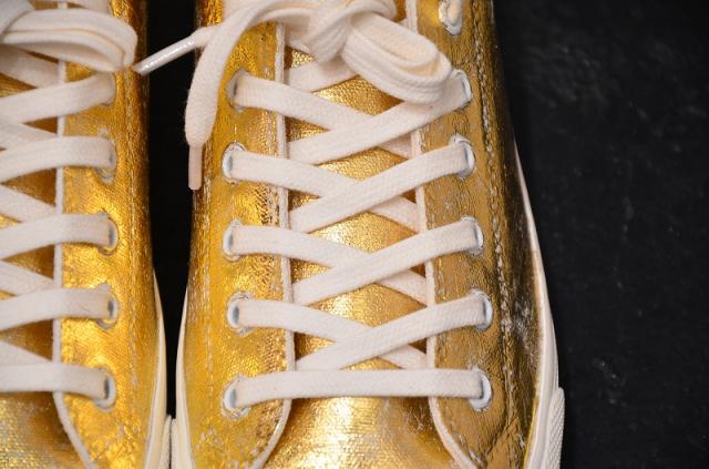 洗い方:箔部分はやわらかいスポンジに中性洗剤をつけて水洗いを推奨致します。ブラシなどで強くこすってしまうと箔が大きく剥がれてしまうので、やさしく丁寧に洗ってください。箔部分の汚れがどうしても気になる場合は軽くなでるように洗い、すすぐ時は箔をこすらないようにご注意ください。スニーカーの内側とインソールに関しましては、通常のスニーカーを洗う程度の処理をして頂いて問題ございません。