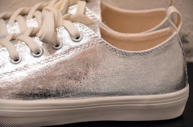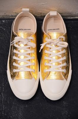 シンプルな白のキャンバスにあざやかなゴールドとシルバーの箔が重なり、プティローブノアーらしさが溢れるスニーカーに。シンプルな装いにも、ドレッシーなスタイルにも組み合わせたくなる存在感です。履くほどに独特な風合いに仕上がることも魅力です。煌びやかな見た目から少しくすんだ表情に変化し、使う人の個性が現れてきます。自分だけの特別な一足になりますように。