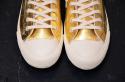 シンプルな白のキャンバスにあざやかなゴールドとシルバーの箔が重なり、プティローブノアーらしさが溢れるスニーカーに。シンプルな装いにも、ドレッシーなスタイルにも組み合わせたくなる存在感です。履くほどに独特な風合いに仕上がることも魅力です。煌びやかな見た目から少しくすんだ表情に変化し、使う人の個性が現れてきます。自分だけの特別な一足になりますように。