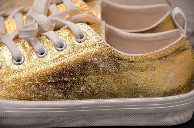 洗い方:箔部分はやわらかいスポンジに中性洗剤をつけて水洗いを推奨致します。ブラシなどで強くこすってしまうと箔が大きく剥がれてしまうので、やさしく丁寧に洗ってください。箔部分の汚れがどうしても気になる場合は軽くなでるように洗い、すすぐ時は箔をこすらないようにご注意ください。スニーカーの内側とインソールに関しましては、通常のスニーカーを洗う程度の処理をして頂いて問題ございません。