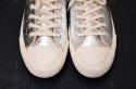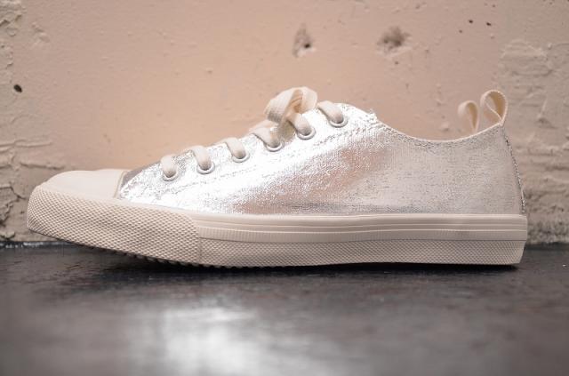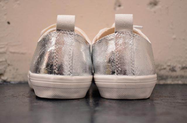 シンプルな白のキャンバスにあざやかなゴールドとシルバーの箔が重なり、プティローブノアーらしさが溢れるスニーカーに。シンプルな装いにも、ドレッシーなスタイルにも組み合わせたくなる存在感です。履くほどに独特な風合いに仕上がることも魅力です。煌びやかな見た目から少しくすんだ表情に変化し、使う人の個性が現れてきます。自分だけの特別な一足になりますように。