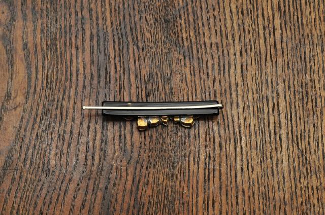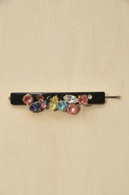 ブラックのベースに大小のカラフルなスワロフスキーが映えるヘアピン。職人がパーツを1点ずつ丹念に仕上げる伝統的な技法「寄せもの」によるモチーフがポイント。ほかのヘアアクセサリーとの重ねづけもおすすめです。
