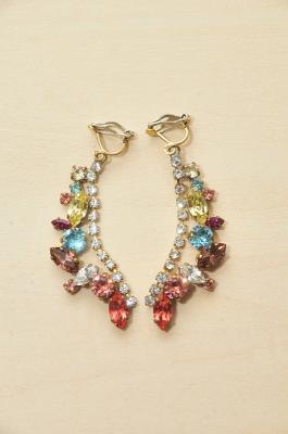 ラフルなマーキス型のスワロフスキークリスタルでデザインされたアール・デコをイメージするモチーフが、横顔をあざやかに、知的に印象づけてくれます。湖のようなブルーが印象的な「クリア」、明るくフレッシュな「イエロー」、クラシックな女性らしさを感じる「ネイビー」の3色展開のイヤリング。熟練した職人が、「寄せもの」と呼ばれる技法で、1つ1つ丁寧に仕上げています。